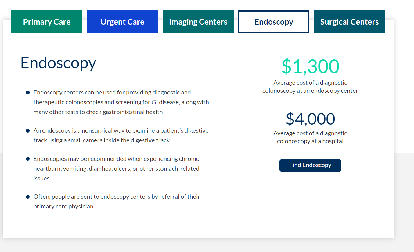 Visit the MIT website to see the cost difference for hospital versus ambulatory centers for elective/preventative services such as diagnostic colonoscopies.